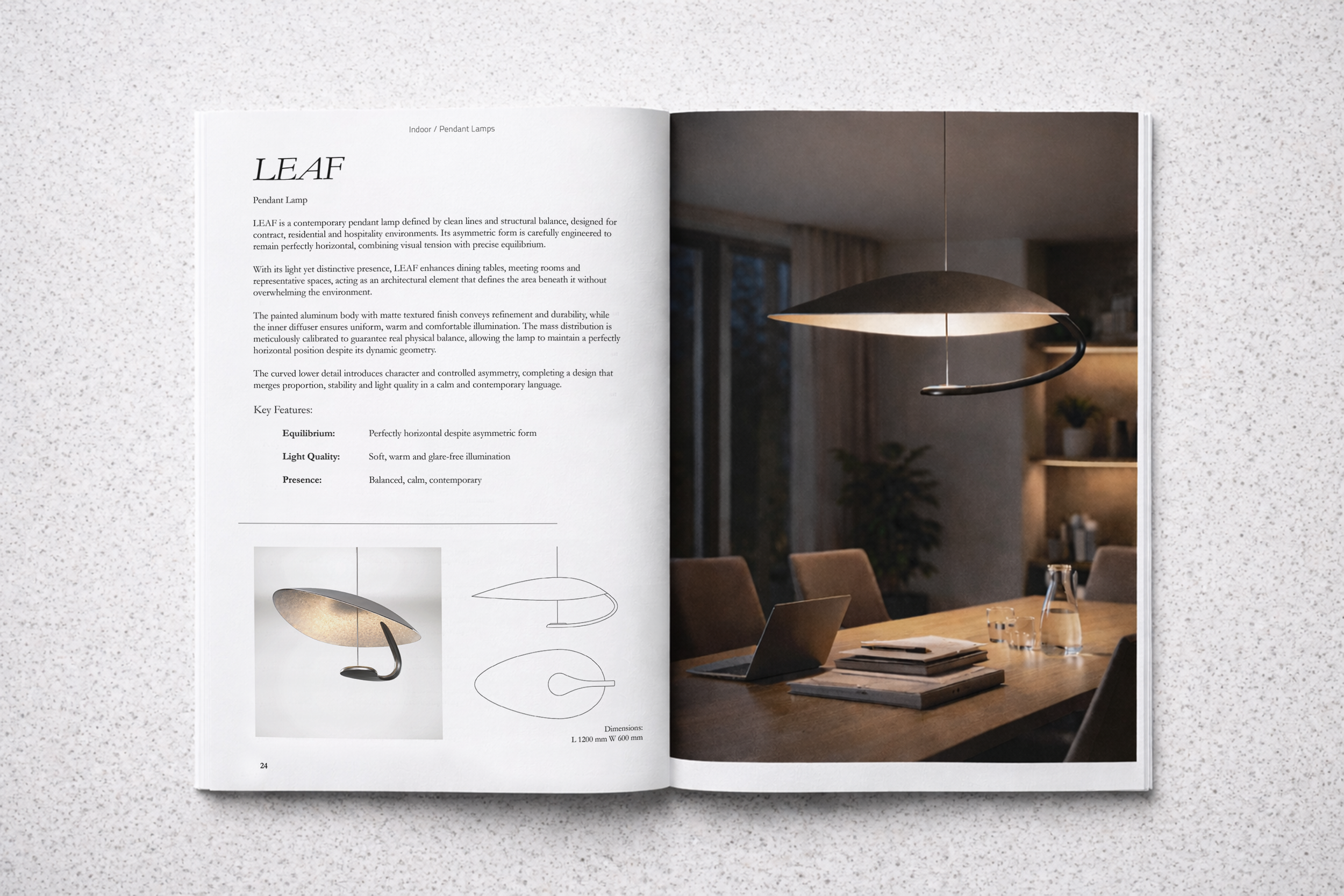 With a length of 120 cm, LEAF works as a horizontal architectural element, defining the space below it while maintaining a sense of lightness and suspension.